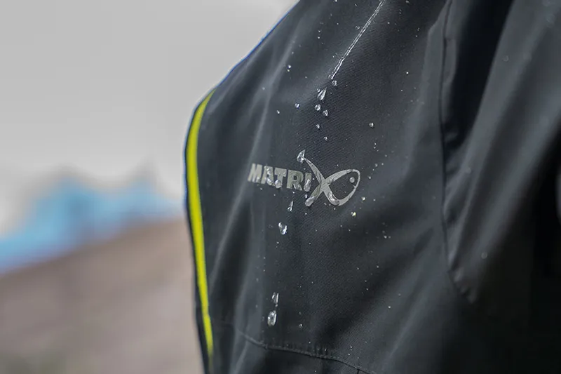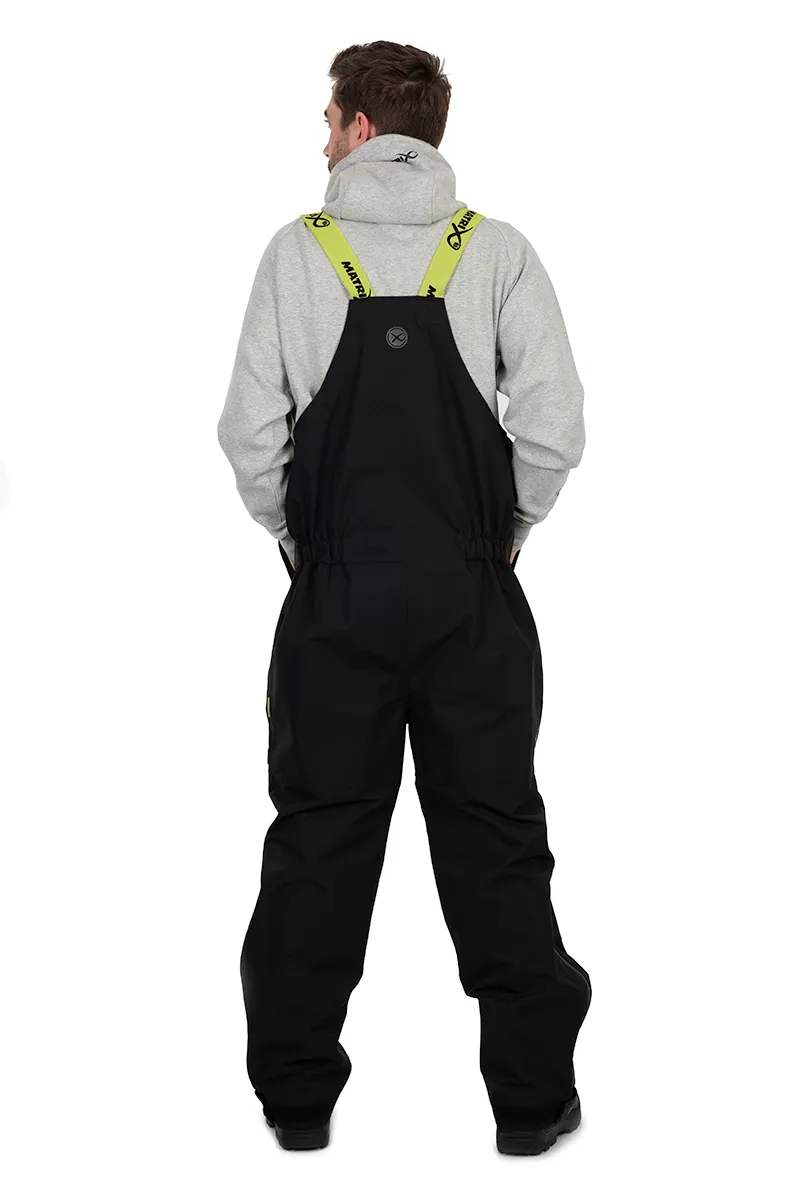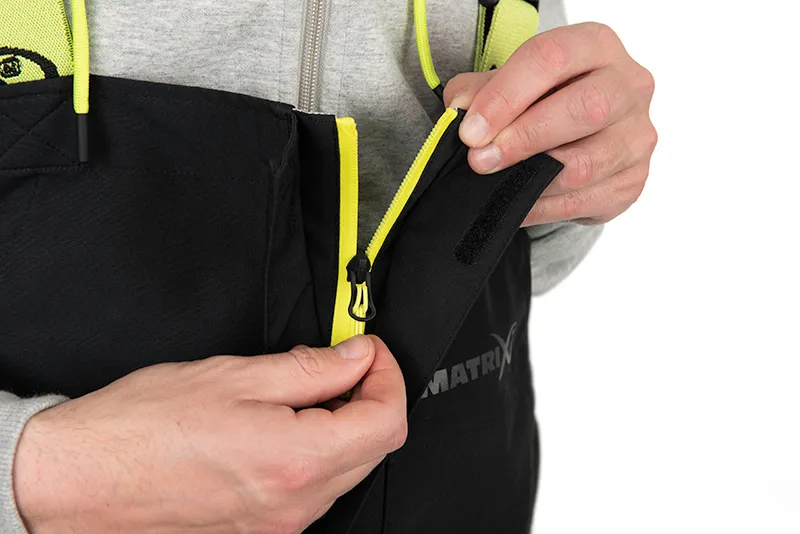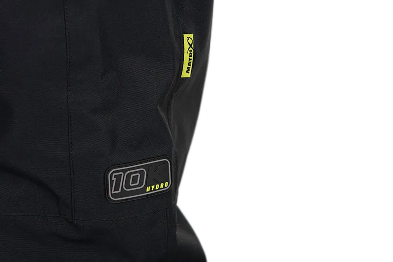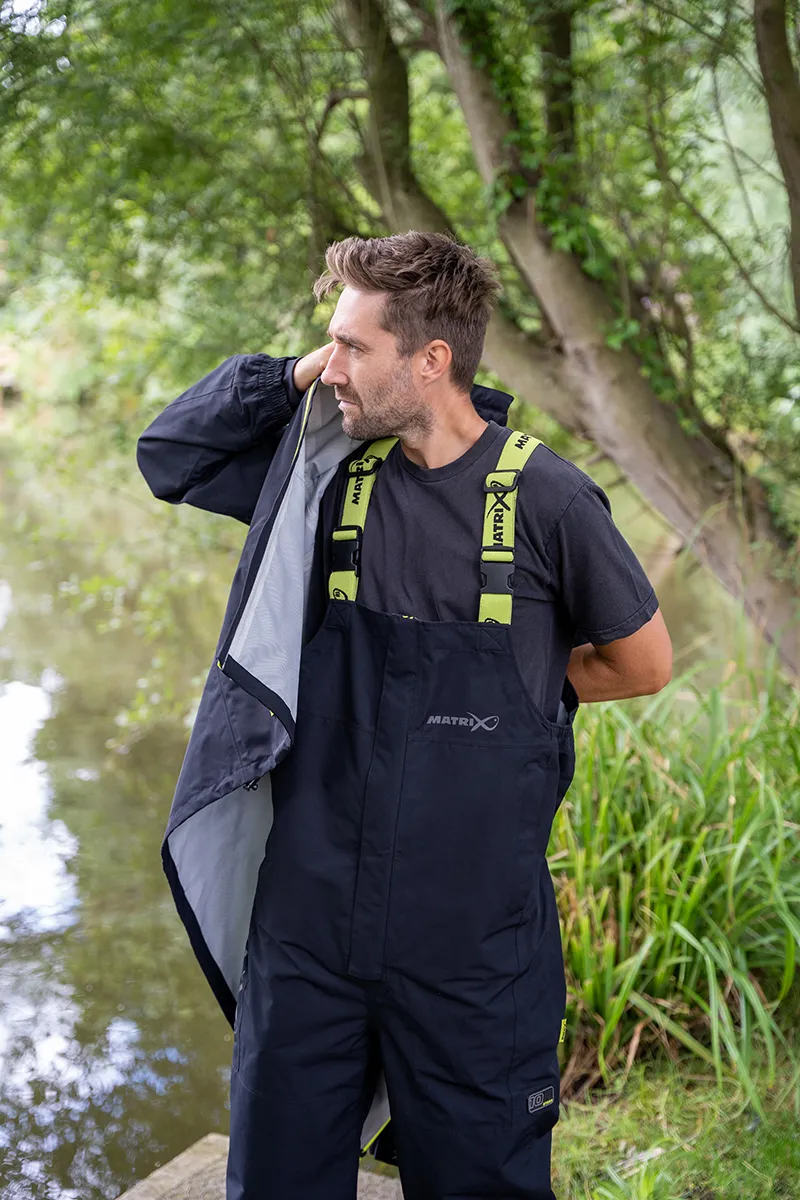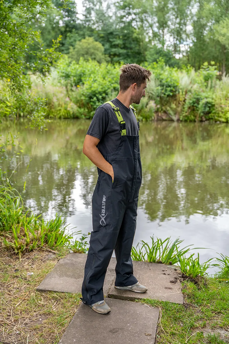 Salopette de pêche étanche Matrix 10K avec colonne d'étanchéité de 10 000mm, respirabilité de 3000g/m2, coutures thermosoudées, et des caractéristiques telles que fermetures à glissière étanches et bretelles élastiquées. Tailles disponibles S à XXXXL.