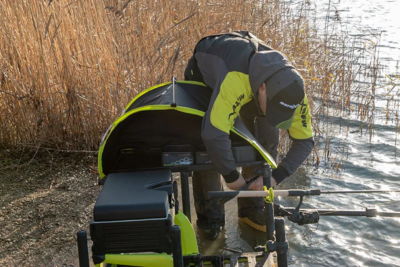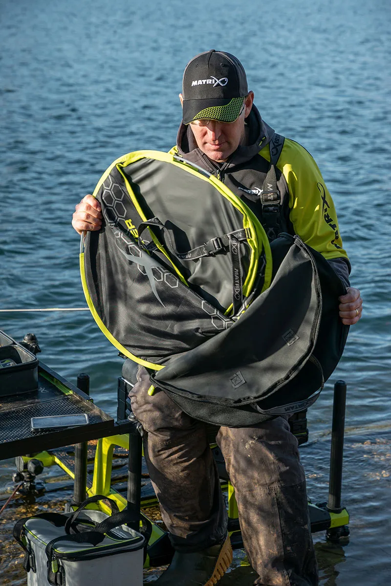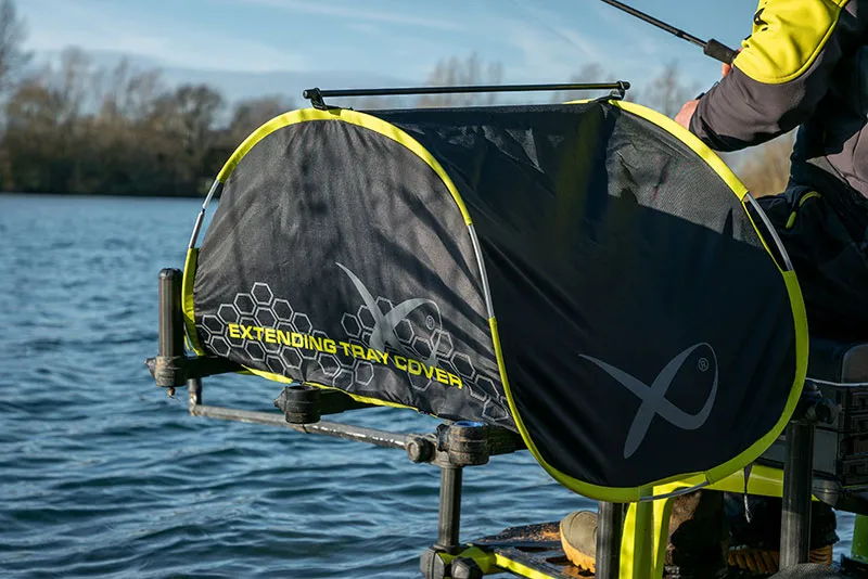 Découvrez le Matrix Extending Side Tray Cover, conçu pour protéger vos appâts des éléments, avec un cadre pop-up, tissu étanche et un design léger. Dimensions: L700mm x W480mm x H350mm.