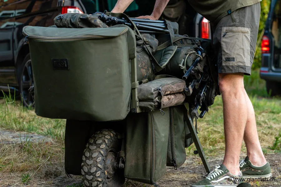 Dank ihrer hochbauenden Konstruktion und verstärkten Struktur behält diese Karrentasche ihre Form, selbst wenn sie schwer mit Kleidung, Ködern, Zubehör oder kleinem Gepäck beladen ist. Die für Nash-Karren vorgesehenen Befestigungssysteme gewährleisten sicheren Halt während des Transports, egal ob Sie auf befestigten Wegen oder auf unebenem Ufergelände unterwegs sind.