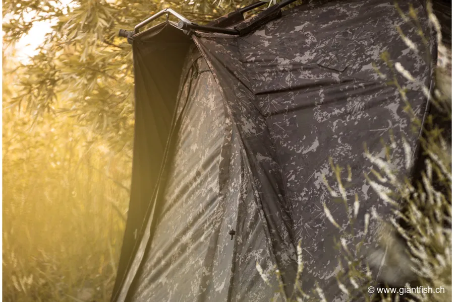 Das Aquasense-Gewebe mit 20.000 mm Wassersäule gewährleistet ausgezeichnete Wasserdichtigkeit, selbst bei starkem Regen, und bietet gleichzeitig gute Abriebfestigkeit. Das Nash-Tarnmuster hilft dem Bivvy, sich in die Umgebung einzufügen, reduziert Reflektionen und Kontraste und sorgt so für eine unauffälligere Annäherung an die Fische – ein Vorteil für Karpfenangler, die Feinsinn und Diskretion an stark befischten Gewässern schätzen.