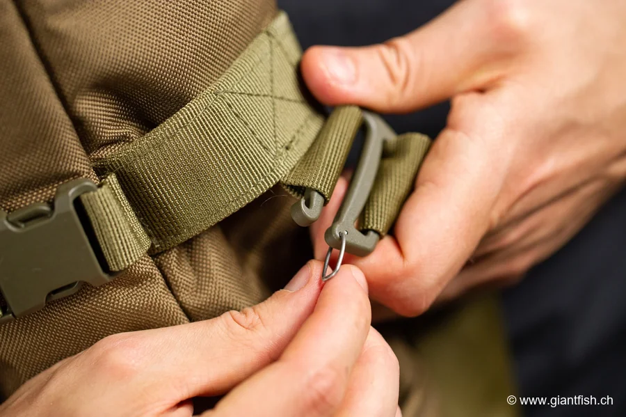 - Seitliche Außentaschen für Kescher, Rutenhalter oder Sturmstangen