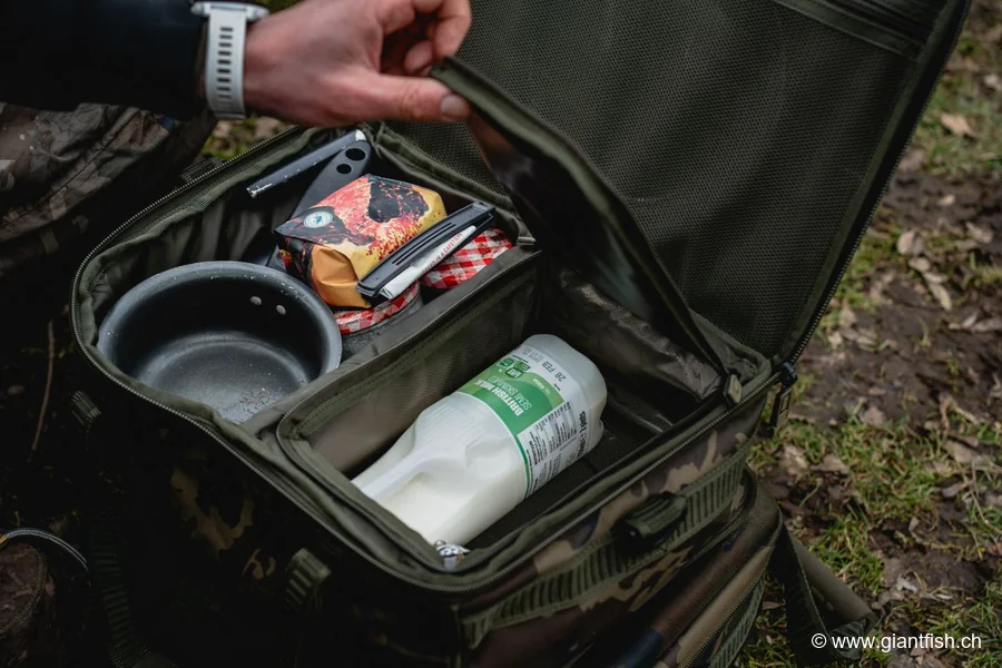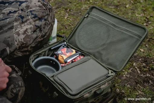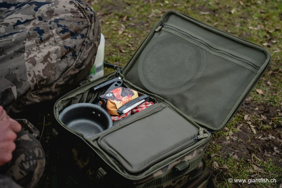 Diese isolierte Verpflegungstasche fürs Angeln zeichnet sich dadurch aus, dass sie Lebensmittelaufbewahrung und Kochgeschirr-Organisation in einem kompakten Produkt vereint. Sie bietet eine All-in-One-Lösung, die verhindert, dass mehrere Taschen und Kisten rund ums Bivvy verteilt werden müssen. Die interne Isolierung trägt dazu bei, die Kühlkette besser zu erhalten — ein echter Vorteil bei langen Sommerschichten oder wenn der Stellplatz weit vom Fahrzeug entfernt ist.