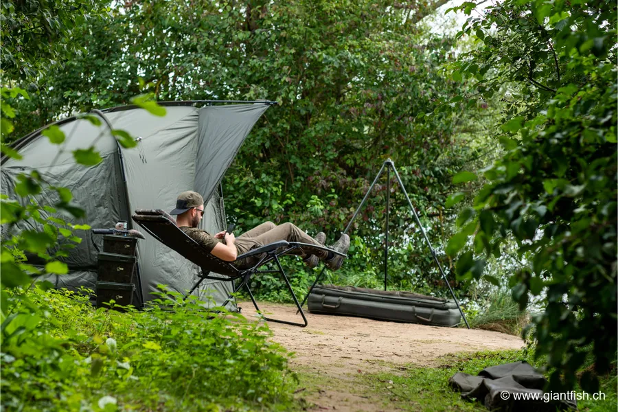 Um Ihre NASH Angelliege voll auszunutzen, stellen Sie sie auf möglichst ebenen Untergrund und sorgen Sie dafür, dass jedes Bein festen Bodenkontakt hat. Stellen Sie dann die Rückenlehne mit den Hebeln unter den Armlehnen so ein, dass sie Komfort und gute Sicht auf Bissanzeiger und Ruten vereint. Eine leichte Neigung reicht oft, um den unteren Rücken zu entlasten und zugleich bereit zum Anschlag zu bleiben.