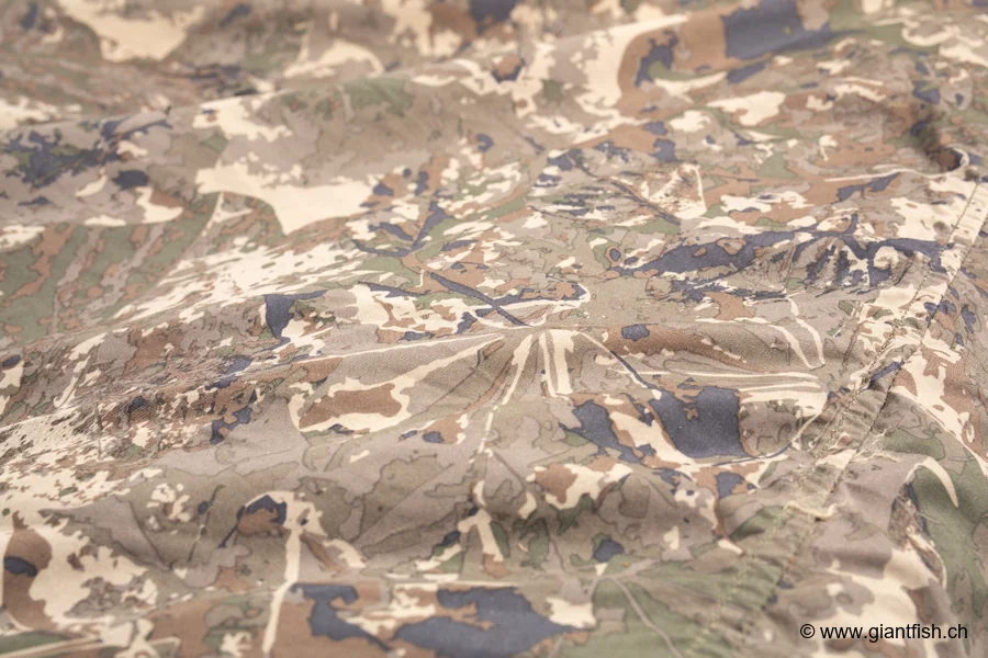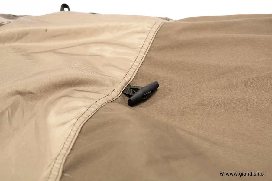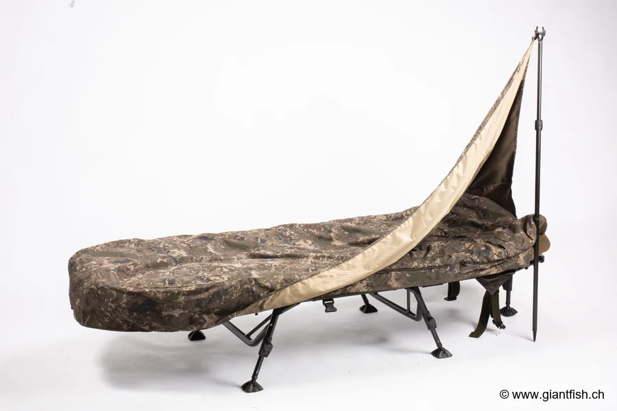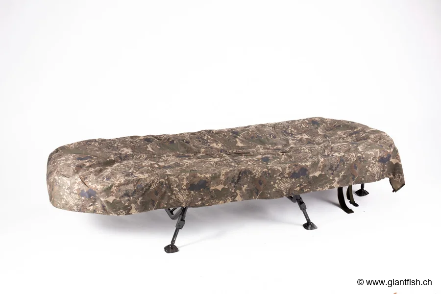 Die Tarnoptik lässt die Decke unauffällig in die Umgebung einfügen, was sie zur natürlichen Wahl für Karpfenangler macht, die auf Diskretion an ihrem Platz achten. Die umhüllende Form, ergänzt durch einen windabweisenden umlaufenden Saum, hilft, Zugluft zu reduzieren und gleichzeitig überschüssige Wärme entweichen zu lassen.