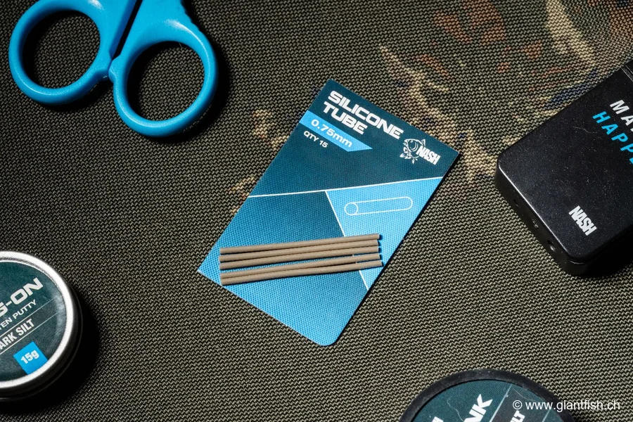 Um dieses Silikonrohr für Karpfenmontagen optimal zu nutzen, schieben Sie es zunächst auf das Vorfach, bevor Sie den Haken binden oder andere Montageelemente fixieren. Schneiden Sie anschließend ein auf die gewünschte Montage abgestimmtes Stück zu und positionieren Sie es gezielt dort, wo Schutz oder Formgebung erforderlich ist (Hakenkrümmung für einen Hook-Kicker, zu bedeckender Knoten, Bereich nahe am Blei zur Verbesserung der Anti-Verhedderung).