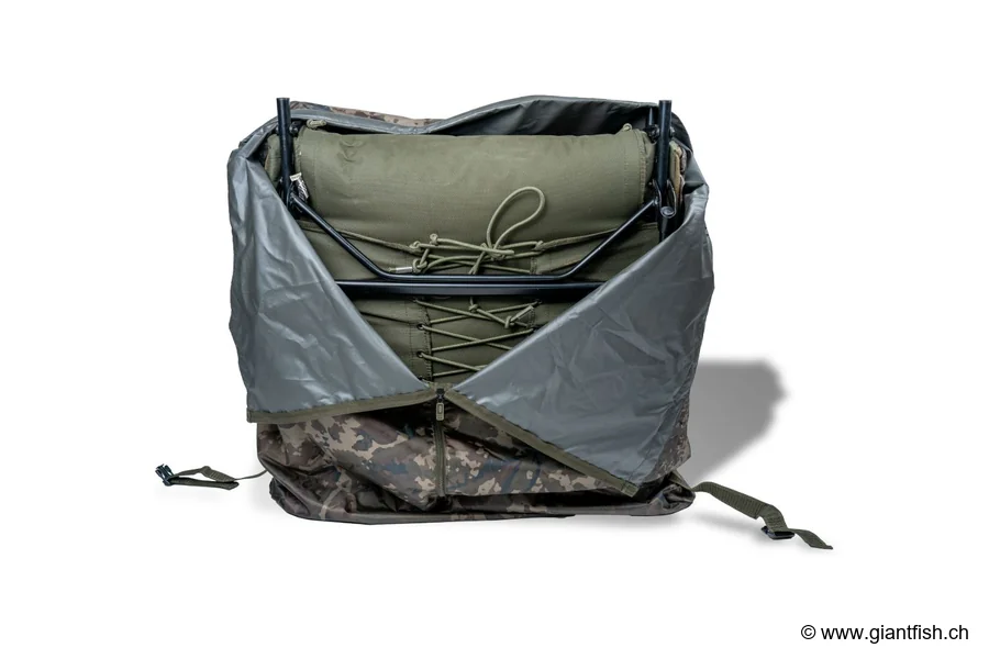 Diese Transporttasche für Bedchair und Sleep-System wurde so bemessen, dass sie NASH-Schlafsysteme sowie eine große Auswahl anderer Modelle aufnehmen kann. Ihr Volumen erlaubt das Verstauen besonders großzügiger Schlafsysteme, darunter doppellagige Ausführungen und Sleep-Systeme für vier- oder fünfjährige Einsätze, ohne die Handhabung beim Beladen zu beeinträchtigen.