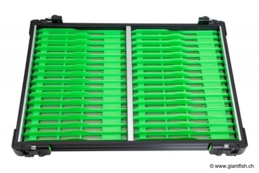 Platzieren Sie das Rive GREEN Spulenablage direkt auf Ihrer Station oder einem kompatiblen Halter. Lagern Sie Ihre vorab vorbereiteten Montagen darauf, um während der Session schneller reagieren zu können. Idealerweise kombinieren Sie dieses Tablett mit Rive Spulen für optimalen Schutz der Schnüre und Haken. Sie können Ihre Spulen nach Durchmesser oder Angeltechnik organisieren, um am Wasser schneller und effizienter zu sein.