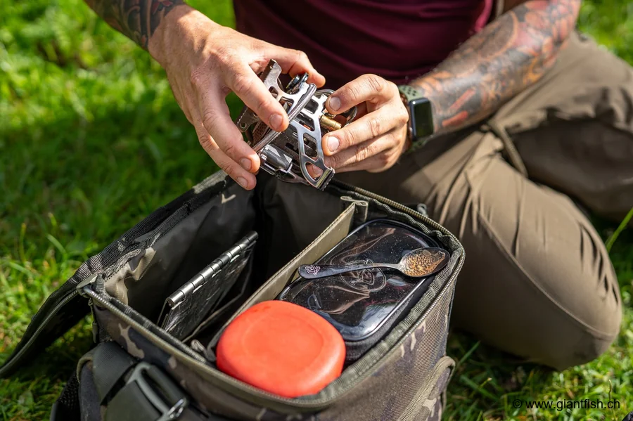 Nutzungs- und MontageempfehlungenStecken Sie alle Ihre wichtigen Dinge in das Hauptfach: kompakter Topf, Kaffeemaschine, Tassen und Utensilien. Platzieren Sie den Kocher und die Gaskartusche in der großen Vordertasche für schnellen und sicheren Zugriff. Um die Modularität weiter zu verbessern, verwenden Sie Korda-Aufbewahrungsboxen oder Compac-kompatibles Zubehör, um jedes Teil zu trennen und Stöße zu vermeiden.