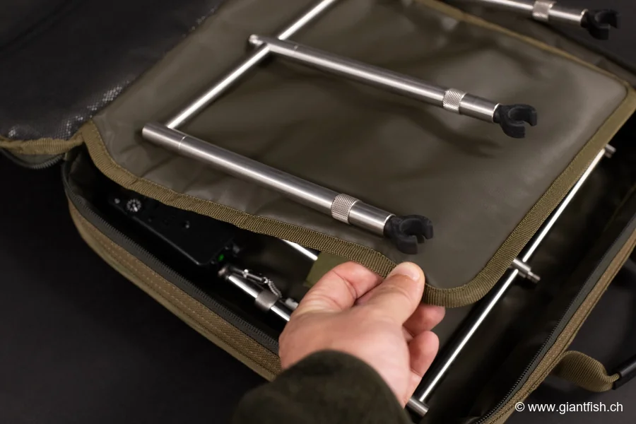 Für eine optimale Nutzung platzieren Sie Ihre Buzzer Bars und Singlez-Halterungen in den dafür vorgesehenen Fächern und achten darauf, dass jeder Teil perfekt von der Polsterung und der mittleren Klappe geschützt ist. Dieses System ist ideal für Angler, die bei der Installation und Abbau Zeit sparen möchten, da die Tasche es ermöglicht, den Großteil Ihres Singlez-Systems montiert zu halten. Am Wasser angekommen, genügt es, den Spike in den Boden zu stecken, die Halterung zu positionieren und Ihre Ruten zu installieren, um in wenigen Augenblicken startklar zu sein. Es wird empfohlen, die kleinen Zubehörteile systematisch in den Innentaschen zu verstauen, um Verluste zu vermeiden und die Organisation Ihrer Ausrüstung zu optimieren.