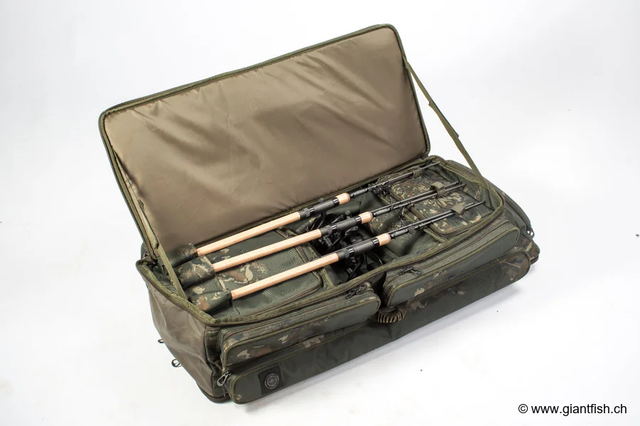 Antwort: Das Hauptfach, die Seitentaschen und die verstärkte Ober Tasche sind so konzipiert, dass montierte Ruten im passenden Format, Zubehör, Köder und persönliche Gegenstände Platz finden, um die Anzahl der Gepäckstücke am Wasser zu reduzieren.