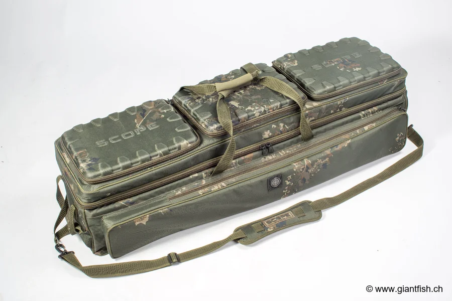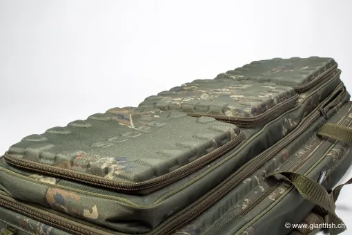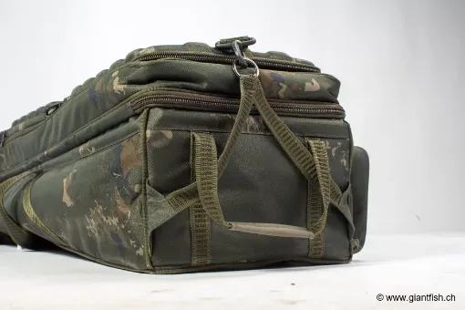 Diese all-in-one Karpfen-Transporttasche zeichnet sich dadurch aus, mehrere einzelne Gepäckstücke zu ersetzen. Durch die Kombination von Rutenetui, Materialtasche und Kühlschrankfach in einer Tasche reduziert sie Platzbedarf und die Anzahl der Gänge zwischen Fahrzeug und Angelplatz.