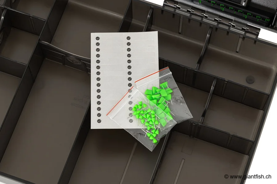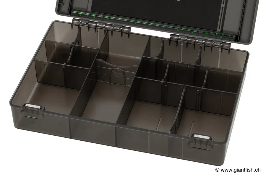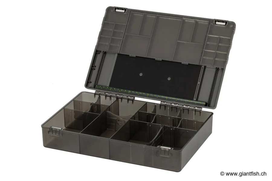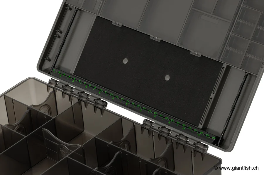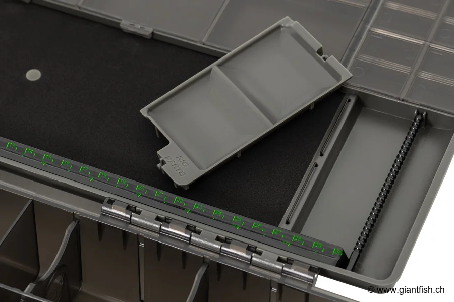Nutzungs- und Montagetipps Um den vollen Nutzen aus der Korda Tackle Box Large zu ziehen, wird empfohlen, Ihre Accessoires in den 29 Fächern des Deckels nach Familien (Haken, Wirbel, Gewichte, Montagezubehör usw.) aufzuteilen. Verwenden Sie das Rig-Tablett und seine Aluminiumstange, um Ihre Setups einfach vorzubereiten, während der integrierte Maßstab maximale Präzision bietet. Die Hauptbox fasst problemlos Spulen, Werkzeuge und sperriges Zubehör, das den modernen Angelvorlieben entspricht. Für eine optimale Anordnung Ihrer kleinen Komponenten platzieren Sie die separat angebotenen Mini Compartment Boxes.