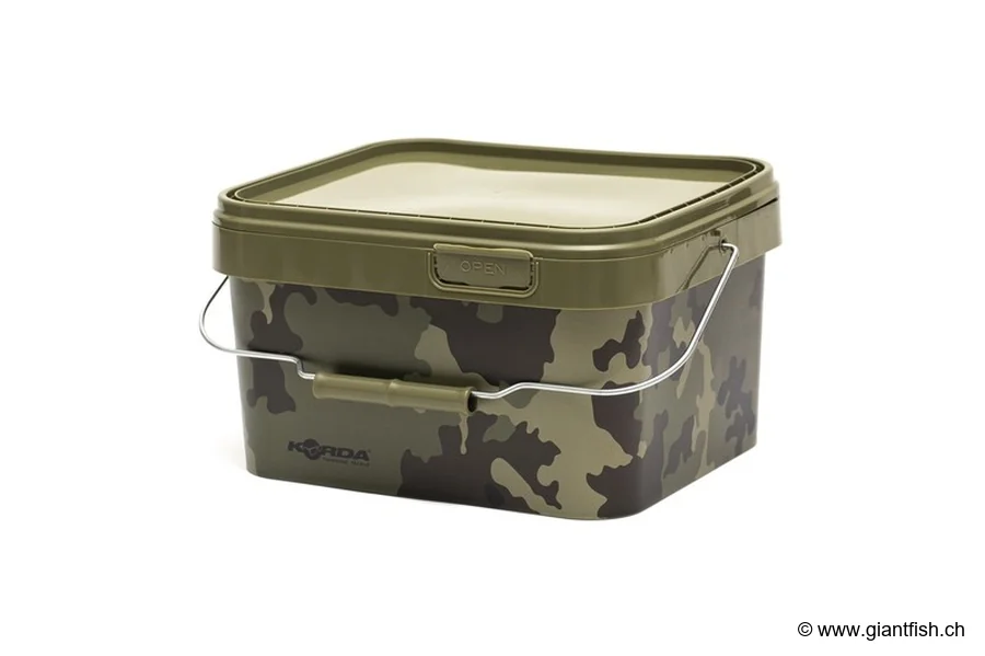 baiting spoon, or any other accessory. Its hermetic lid protects your baits from moisture, weather, and leaks during transport, and the KAMO camouflage finish ensures discretion of equipment at the water's edge. The Korda Compac 5L Bucket also stands out for its solidity, ease of stacking with other buckets in the range, and its ability to serve as an auxiliary table in the bivvy thanks to its wide rim.