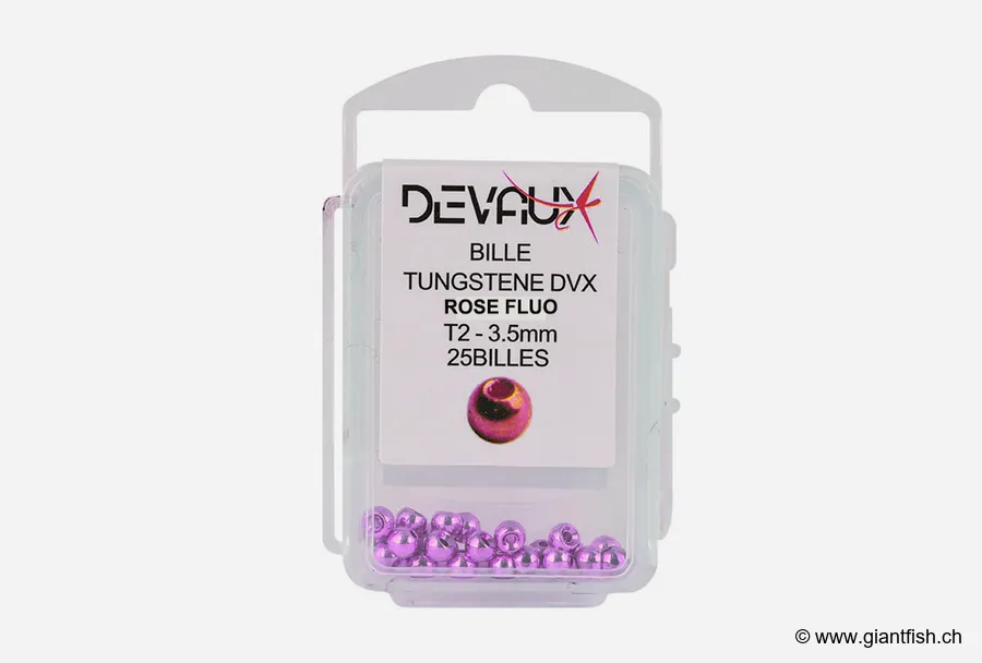 Product benefits and highlightsUsing Devaux fluorescent pink tungsten beads lets you reach target depths faster thanks to a density superior to traditional beads. The fluorescent pink hue, highly attractive, improves fly visibility under challenging conditions, significantly increasing your results. Thanks to their careful design, these beads reduce line wear and ensure smooth passage over the hook, making tying more enjoyable, precise and long-lasting. The combination of Devaux’s advanced machining technology and the choice of tungsten guarantees optimal efficiency, even on the most wary fish.