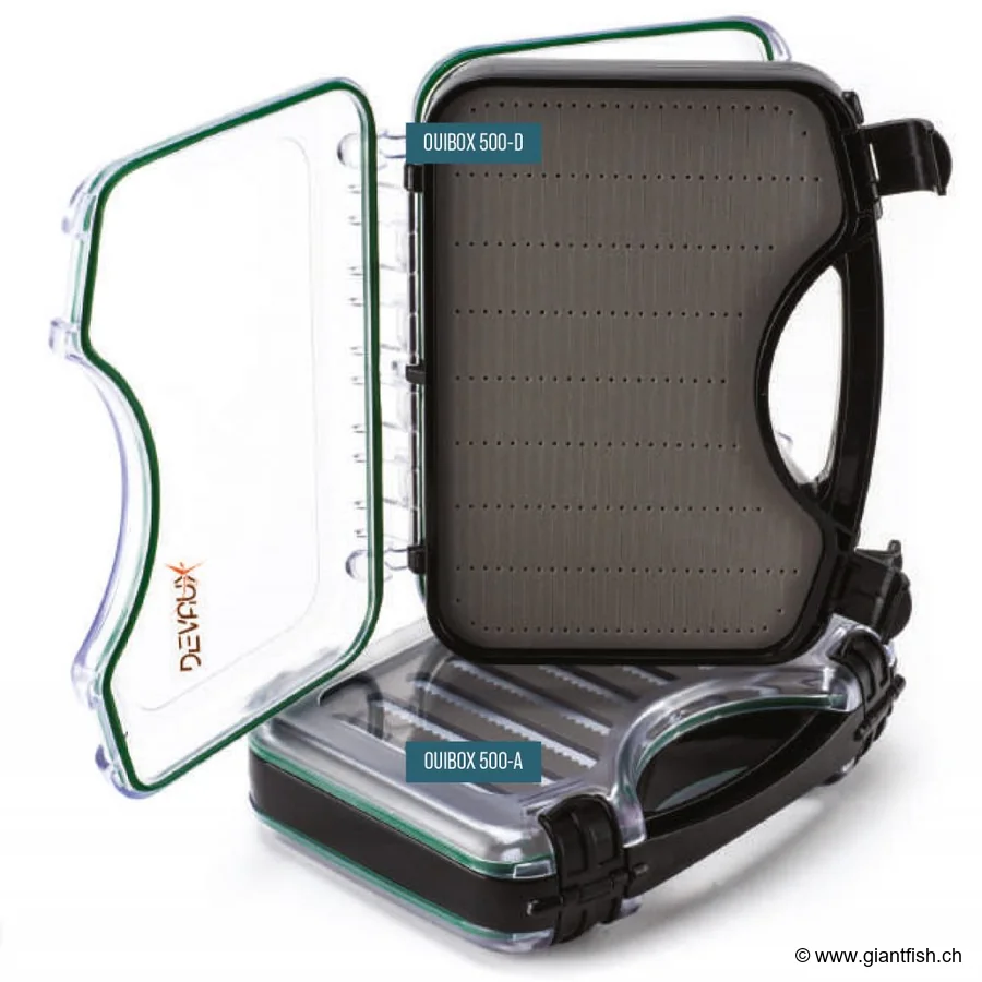 Devaux Ouibox 500 offers undeniable advantages. Its water resistance ensures optimal preservation of flies and streamers, even after intensive use in the rain or frequent handling at the water’s edge. Thanks to its two generous compartments and high-density foams, each fly is protected from crushing and retains its original shape. This innovative design not only makes transport easier with its ergonomic handle, but also guarantees instant, organized access to different streamer models. Anglers can therefore optimize their rigs in no time and react quickly while fishing. The transparent lid allows you to identify the needed streamers at a glance, avoiding wasted time or unnecessary handling.