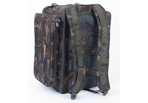 • Conception unique combinant les avantages du sac à dos avec ceux du fourre-tout • Sangles d’épaule 3D antidérapantes et dos matelassé pour un grand confort d’utilisation • Le dos devient couvercle lorsque le sac est pose au sol • Embase moulée rigide renforcée • Compartiment de stockage de longueur intégrale sur un côté, et deux compartiments séparés sur l’autre côté, offrent une grande polyvalence de rangement • Deux sangles amovibles permettent d’arrimer un siège ou un tapis de réception au sac à dos • Poche élastiquée sous le couvercle supérieur pour stockage d’une boite Fox • Profil bas permettant un rangement du sac sous le bedchair • Fermetures à glissières haut de gamme renforcées • Tissu polyester 5000 Deniers 100% traité • Finition camouflage exclusif Fox