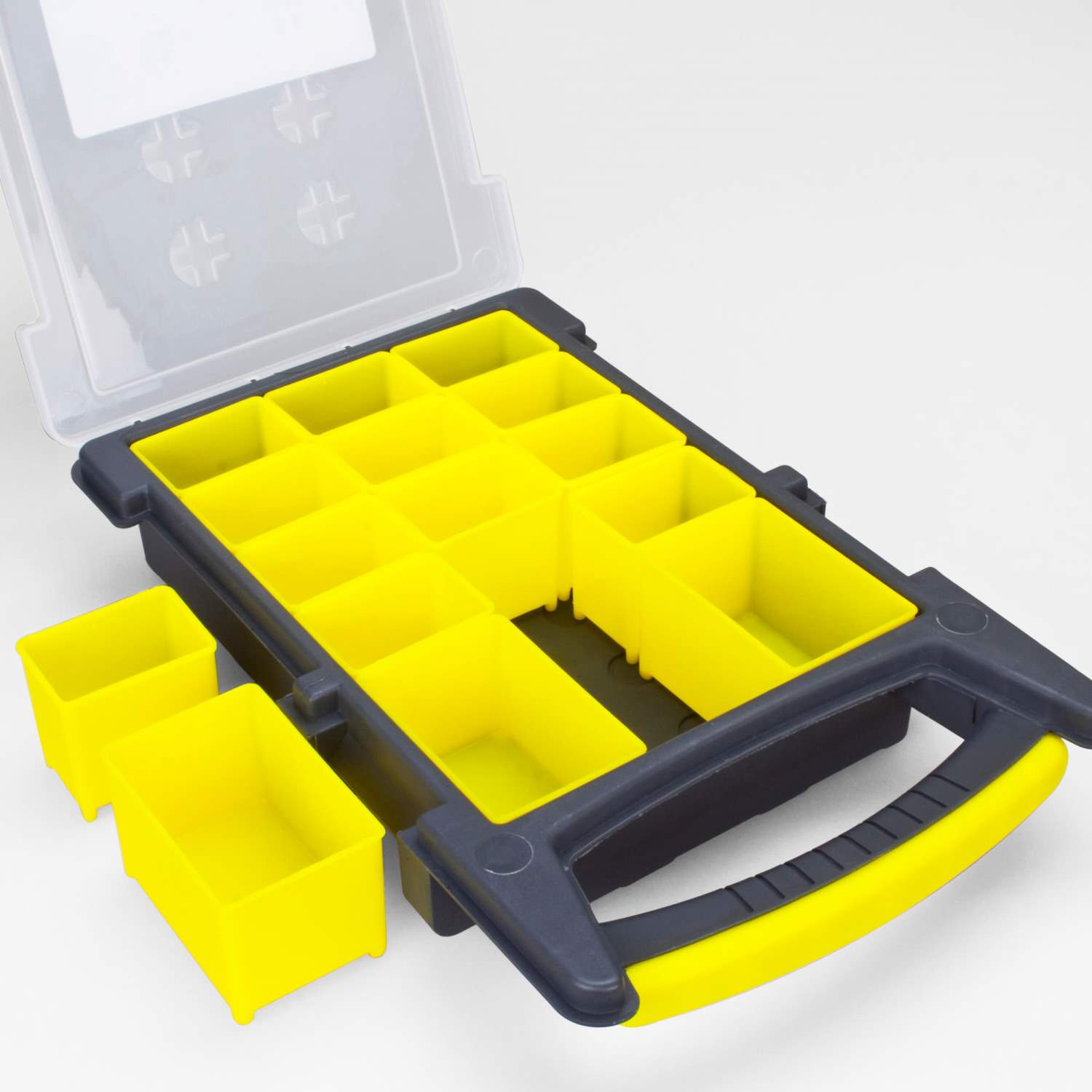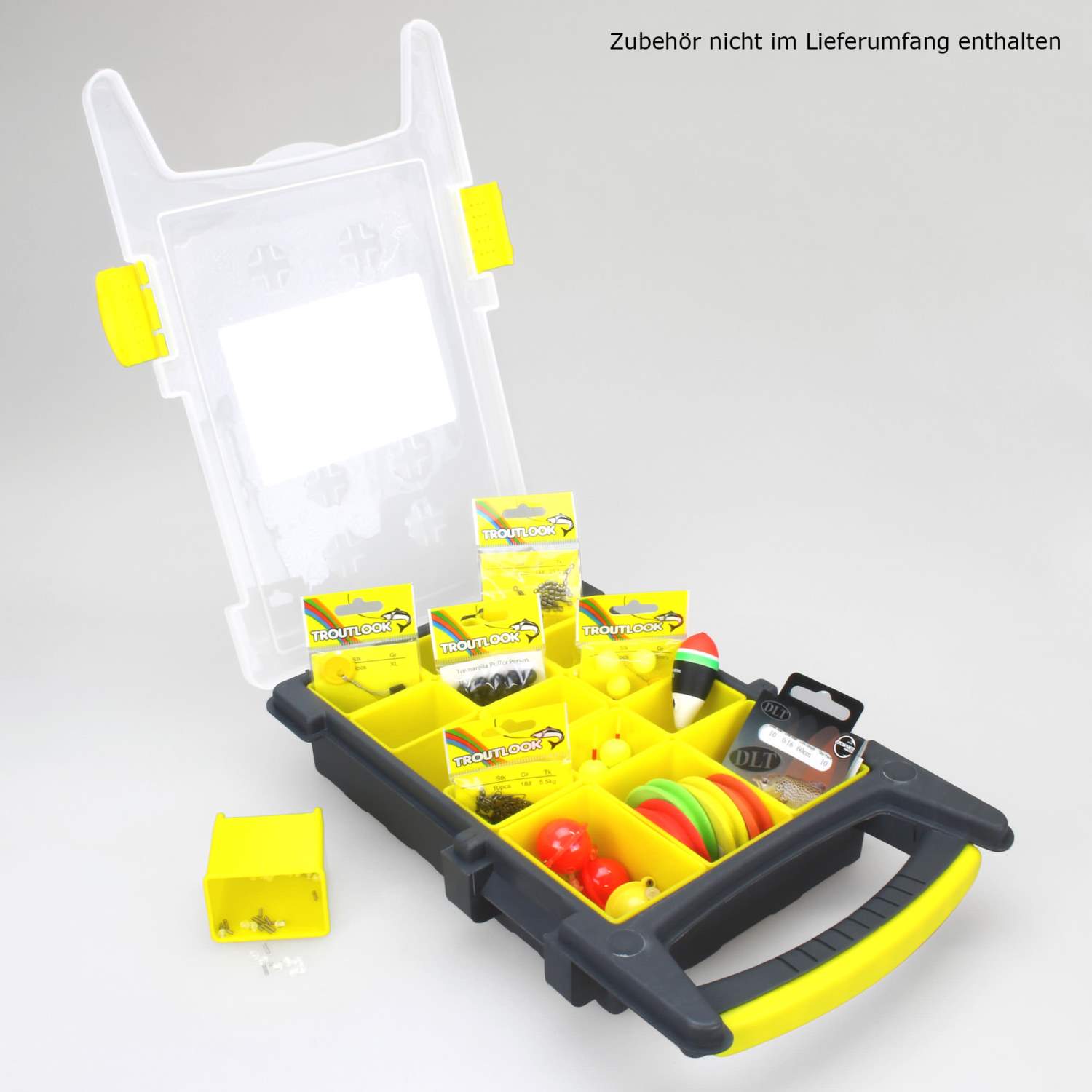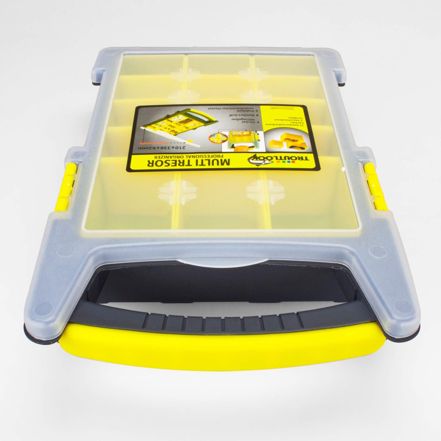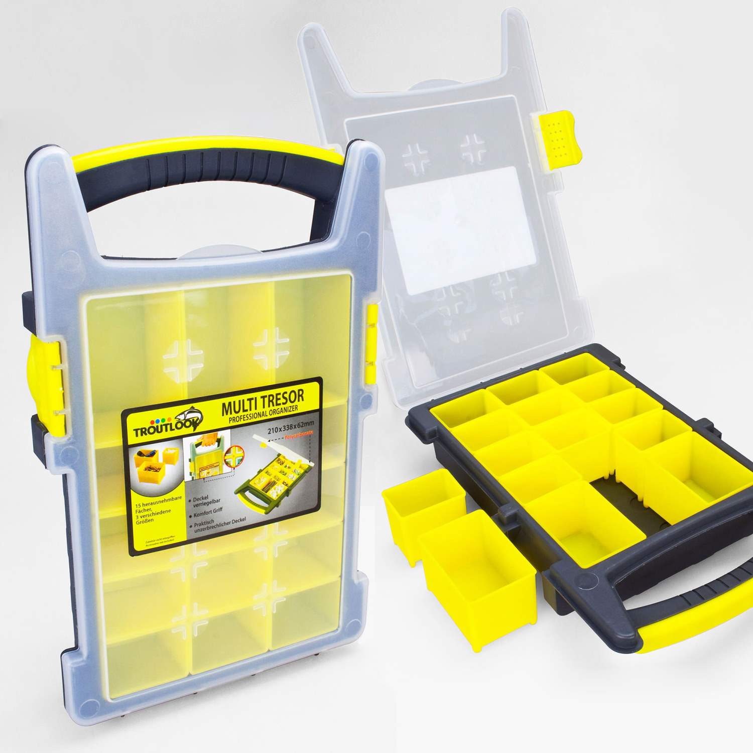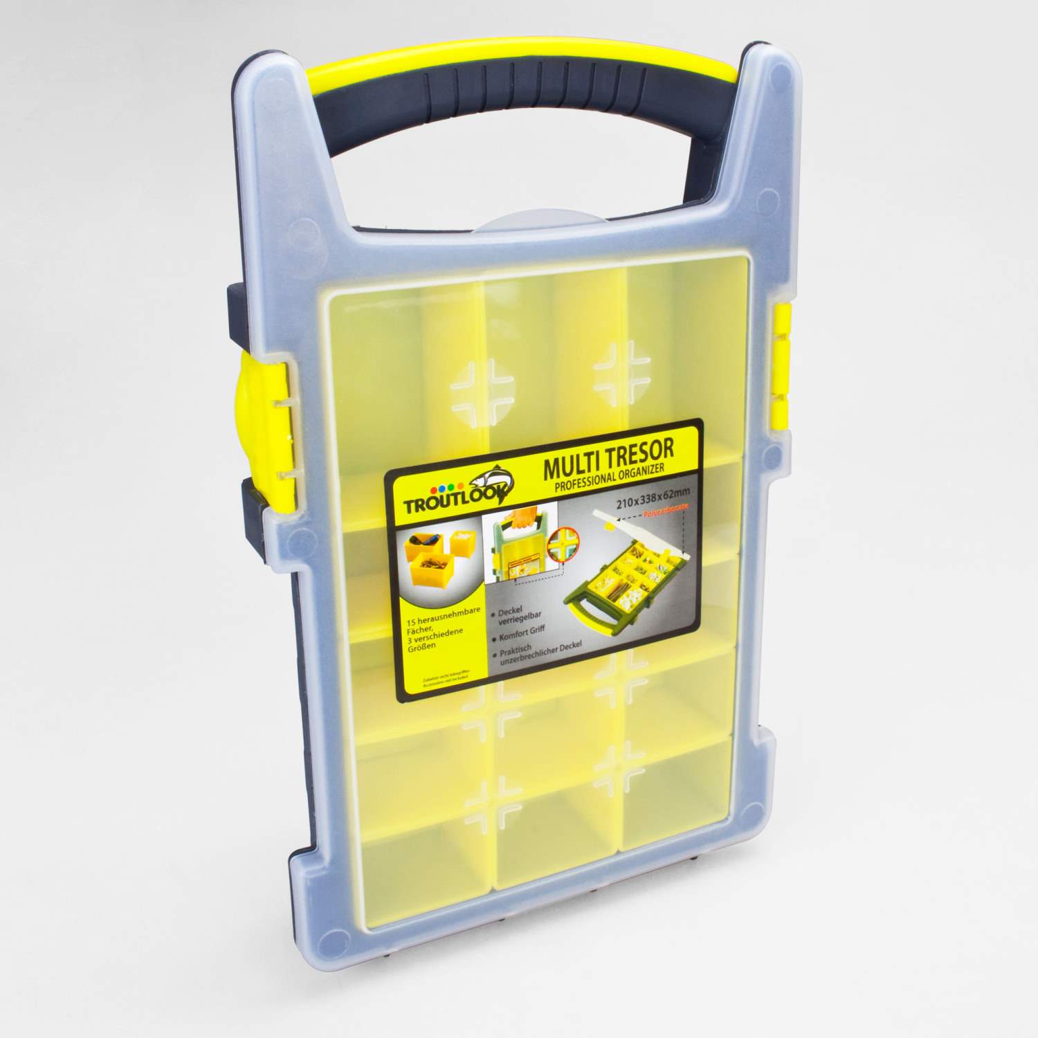 Le Multi Tresor de Troutlook est le talent de l'organisation par excellence. Sous le couvercle semi-transparent se trouvent 15 compartiments pour tous les types de petits accessoires. Par exemple, ils sont idéaux pour les pièces individuelles de montages de truite / tremarella. Si nécessaire, les compartiments individuels peuvent être retirés et utilisés séparément. Vous avez ainsi toujours tous les accessoires individuels à portée de main.Petit, léger et robuste - Le Troutlook Multi Tresor