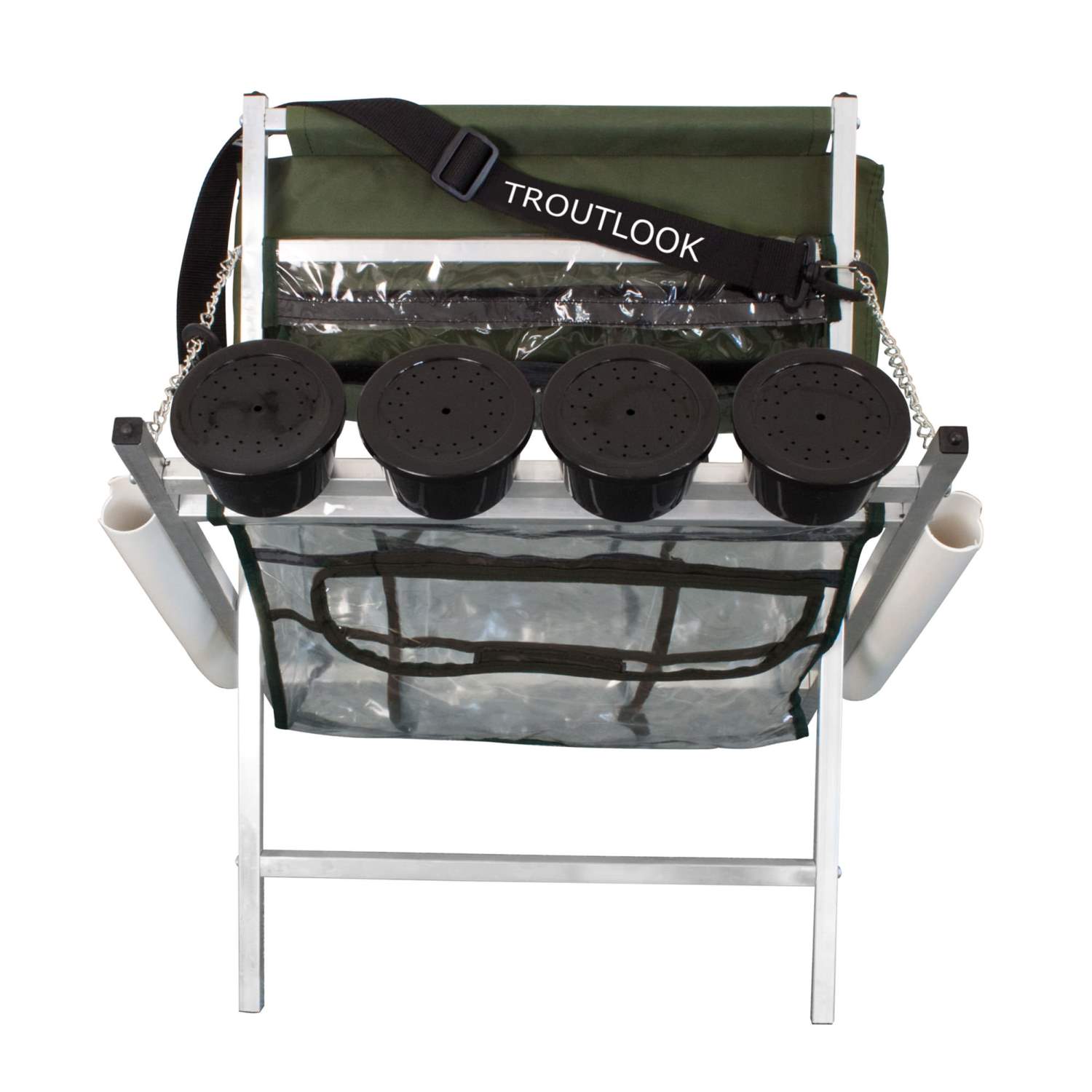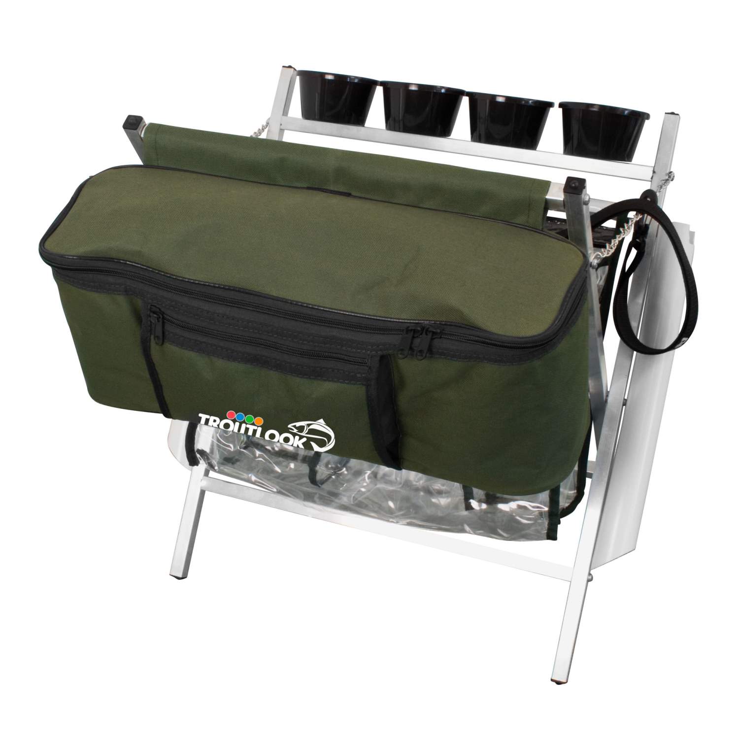 Le sac léger avec le logo Troutlook est pliable et peut être transporté facilement avec la sangle fournie. À droite et à gauche du sac à truites, il y a deux tubes de canne à pêche avec des encoches pour éviter que les cannes ne se tordent, où vous pouvez ranger les cannes à truite en toute sécurité.Troutlook offre tout ce que les pêcheurs de truites modernes attendent