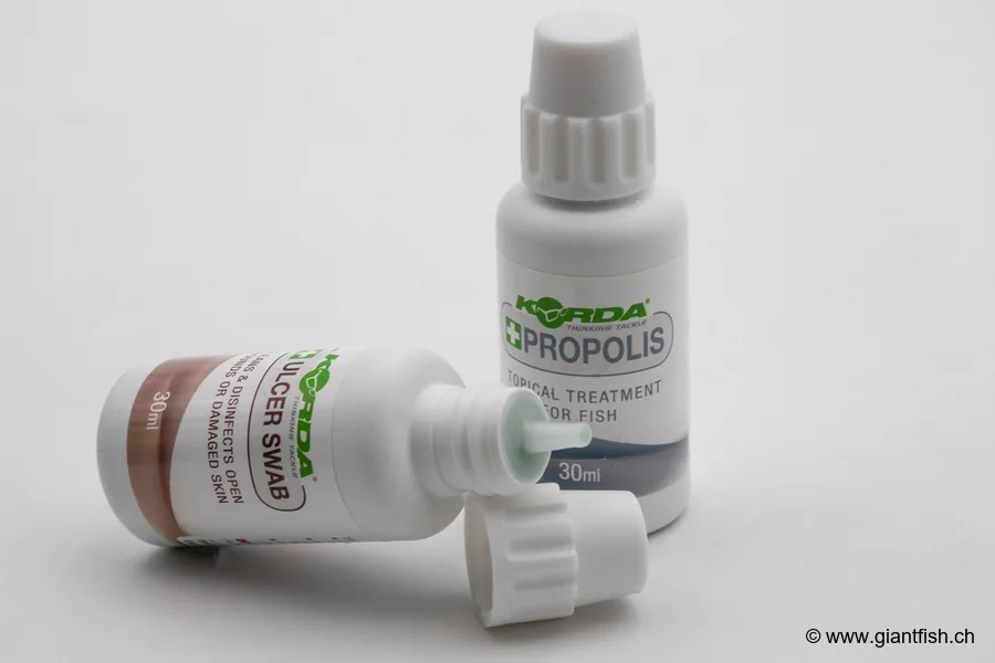 immediate and professional treatment of lesions in carp. Thanks to the synergy between Propolis, known for its natural antiseptic and healing qualities, and the Ulcer Swab developed to disinfect wounds effectively, the risks of bacterial and fungal infections are greatly reduced. The protective pouch allows easy transport of the kit to the water's edge, making it accessible in all circumstances.