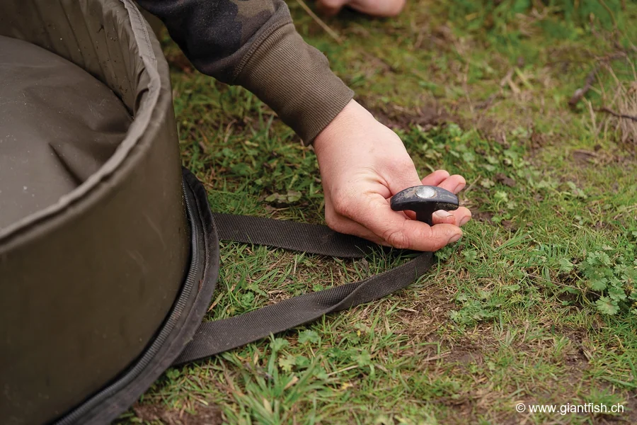 Usage instructions and recommended setups To fully benefit from the Basix Carp Cradle XL's potential, it's ideal to always set it up on a flat surface, away from direct sunlight to ensure optimal comfort for the fish. Before placing the carp, thoroughly wet the mat's surface to preserve the fish's protective layer. Use the lower loop to keep your weigh sling or net readily available. The transport handles also allow the mat to be fixed to the ground with pegs to prevent movement by the wind. After capture, quickly proceed with weighing and release to minimize stress on the fish. For even better care, equip yourself with a care kit like the Korda Basix Carp Care Kit.
