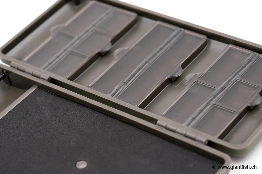 To fully utilize the Korda Rigsafe Combi's capacity, carefully secure your fishing lines on the grooved aluminum bar using the dedicated pins. Use the compartments to sort each accessory type: swivels, beads, shrink tubes, bait stops, etc. Before each departure, ensure the magnetic closure is properly engaged to prevent any risk of accidental opening during transport. The graduated ruler allows you to prepare fishing lines adapted to the desired length, ensuring maximum precision and efficiency in your fishing sessions.