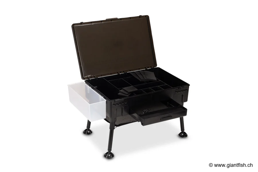 For comfort, the adjustable legs with wide cups ensure stable support even on muddy or sloping banks. The working height becomes more ergonomic, reducing fatigue during long leader-tying sessions. The mesh shelf under the box provides extra storage to keep essentials within reach without cluttering the work surface, while the drawer with integrated rig board protects finished rigs, ready for instant use.