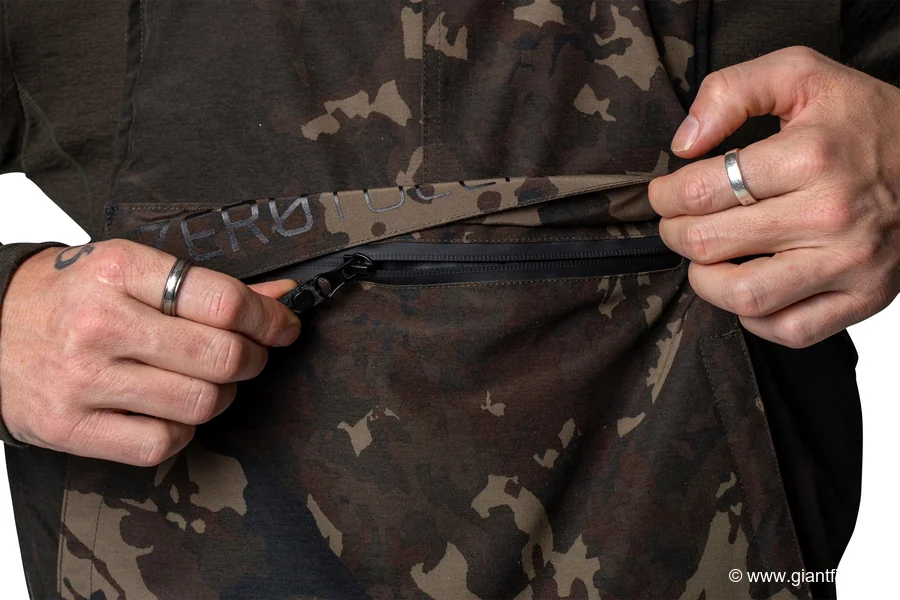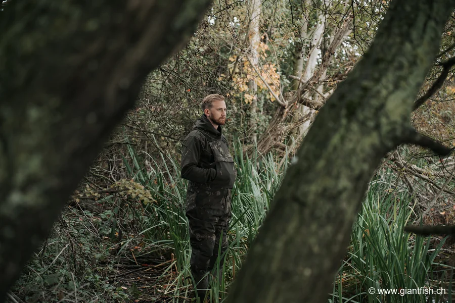 Comfort was also central to this model's development. Neoprene reinforcements at the knees and seat protect against cold and water when kneeling to prepare rigs, taking a trophy photo or handling a fish on the mat. The large internal hand-warming pocket, typical of the Zero Tolerance philosophy, keeps hands warm and dry between actions—a valuable asset during long winter nights.