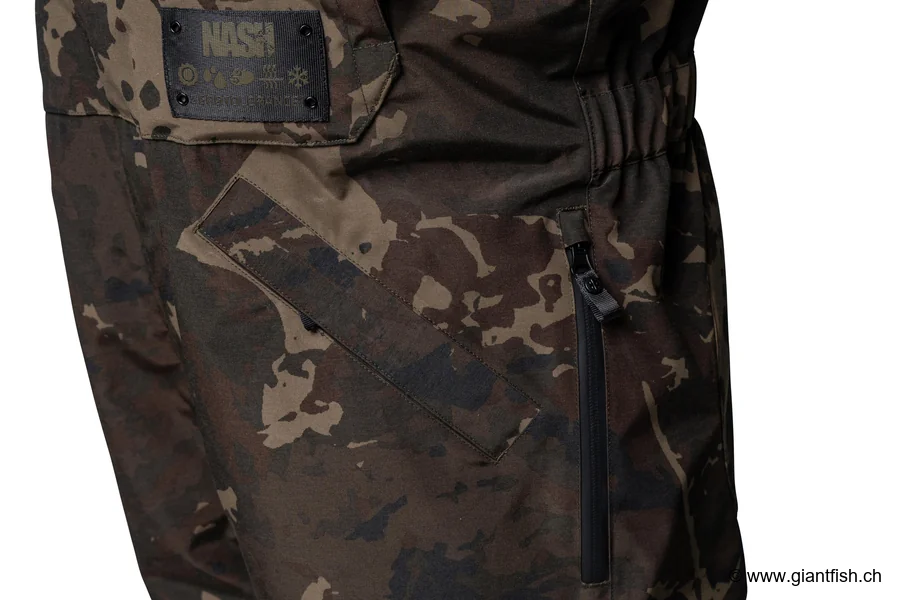 Thanks to its technical outer fabric inspired by NASH bivvy materials, this bib has an almost waxed feel, very different from standard rainwear. This robust surface forms an effective barrier against bad weather and external abrasion, while remaining comfortable to wear when moving, changing position or handling fish.