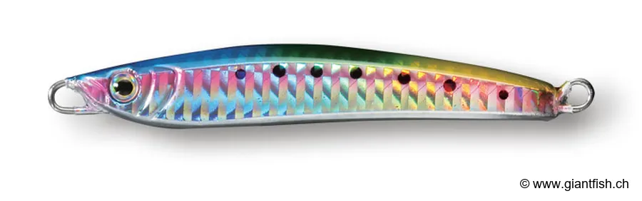 With a rearward center of gravity, this jig sinks very quickly in vertical presentations and casts long distances for shore jigging. On retrieval, its body produces a tight rolling that generates strong flashes of light, imitating an injured baitfish and triggering the hunting instinct of wary predators.