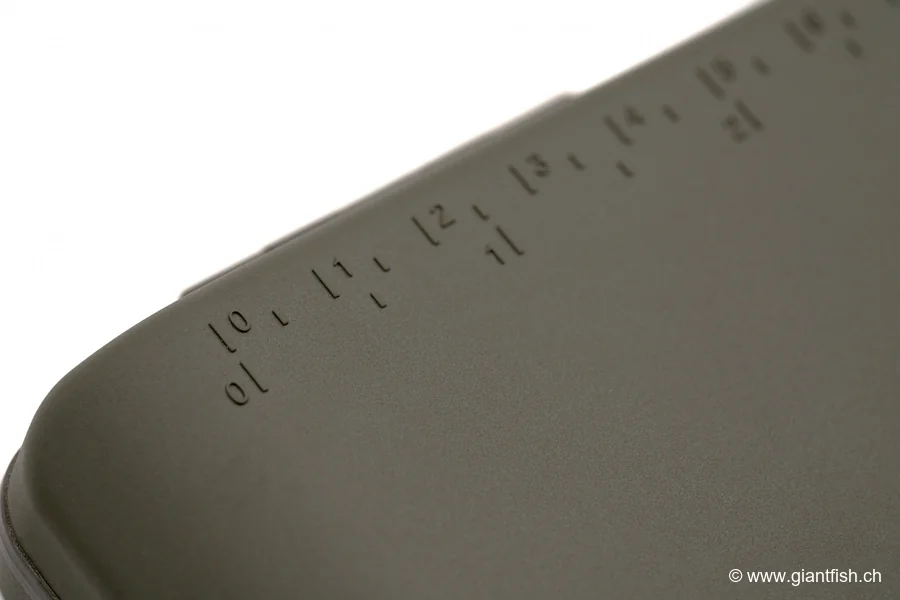 La capacité à accueillir jusqu’à 60 montages permet de couvrir l’ensemble de vos besoins durant une session longue ou plusieurs sorties rapprochées. Le revêtement doux confère un toucher agréable et évite les chocs sur le contenu de la boîte. La règle graduée, pratique et directement visible, facilite la réalisation de bas de ligne à la longueur idéale, augmentant la précision et l’efficacité de votre pêche.