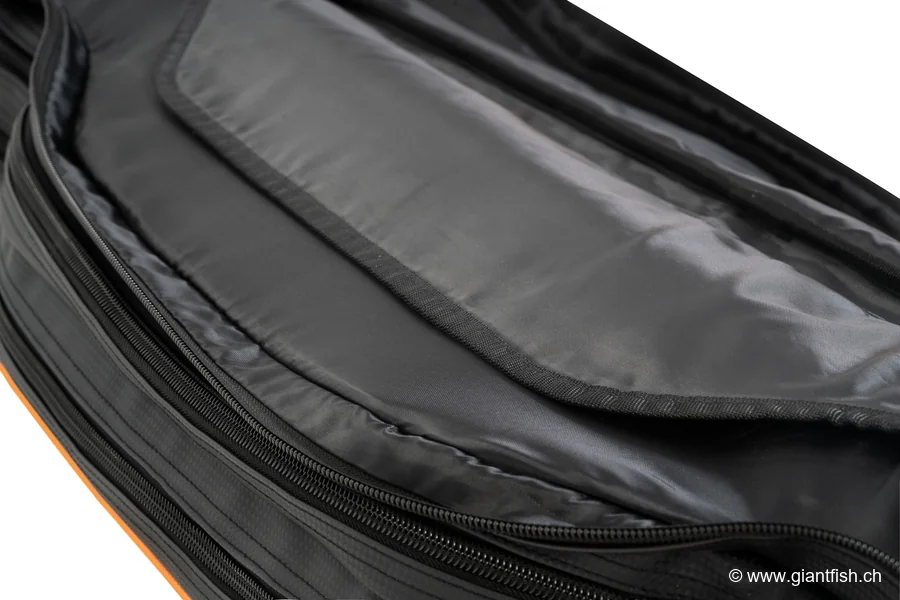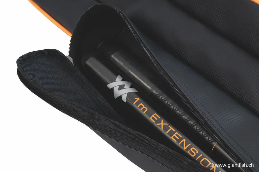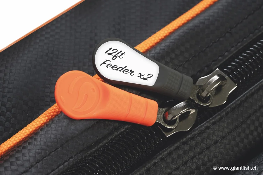 - Deux poches externes zippées pour accessoires (bras feeder, manches d’épuisette, piques de distance, ombrelles à esches, parapluie, etc.)