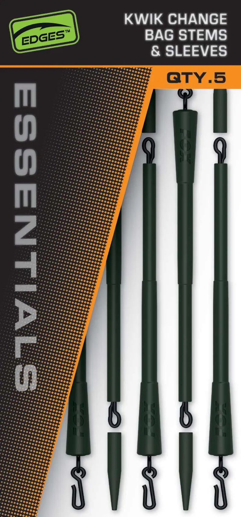 Fox EDGES™ Kwik Change Bag Stems & Sleeves permet de confectionner des sacs PVA solides, changer rapidement les montages via le Flexi Kwik Change Swivel, positionner le plomb sans déchirer le sac. Livré avec Micro Sleeve pour protéger la boucle d’attache. 5 par paquet.