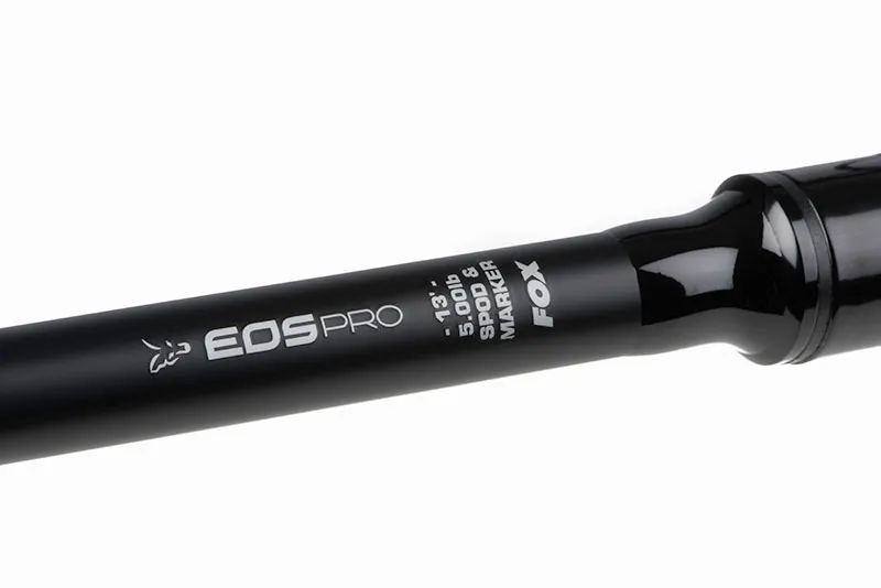 Découvrez la canne à pêche Fox EOS Pro Spod/Marker, en carbone léger avec anneaux Slik Air, finition noir mat et disponible en 12' et 13ft.
