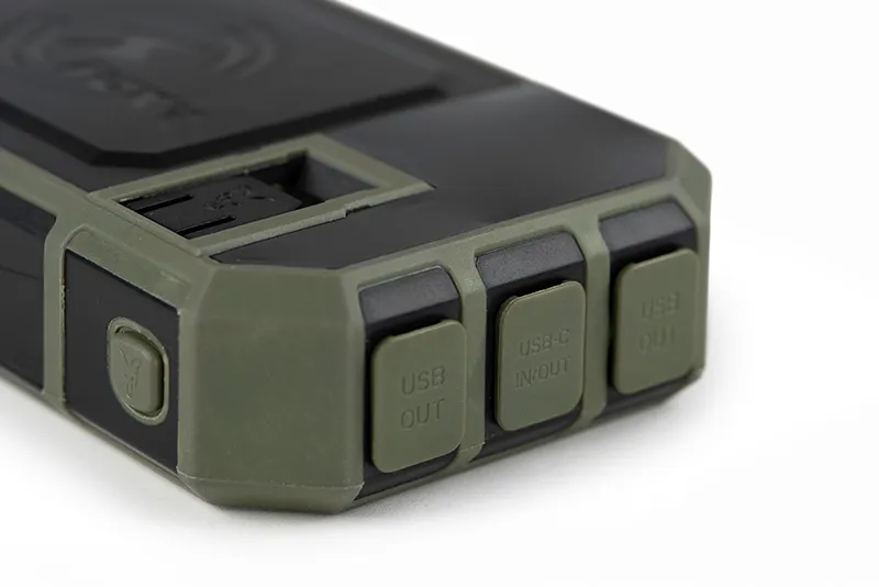 Chargeur sans fil Fox Halo 27K avec capacité de 26800mAh, étanche (IP65), compatible avec tous les derniers smartphones. Permet la recharge avec câble et a un écran LCD pour le niveau de charge.