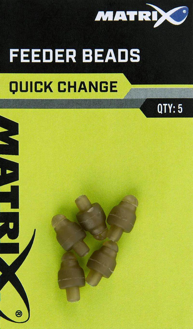 Matrix Quick Change Feeder Beads permettent d'utiliser des feeders inline interchangeables, tube allongé pour auto-ferrage efficace, et de permuter rapidement les bas de ligne. Disponible en paquets de 5.