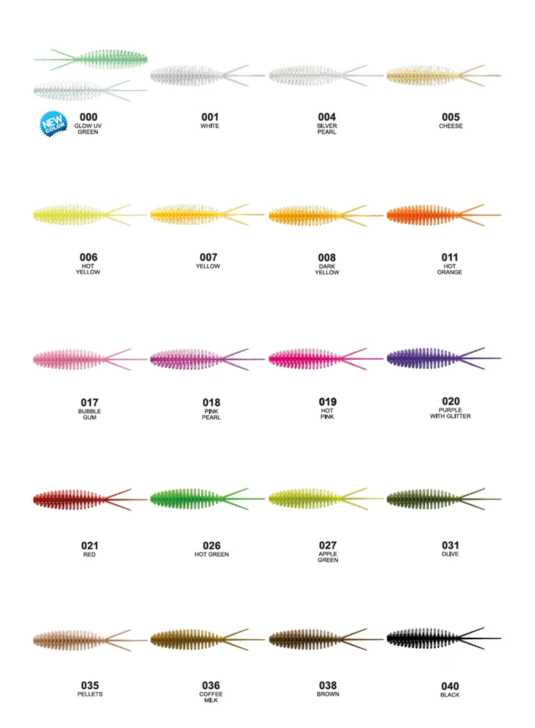 Turbo Worm – En réponse à de nombreuses sollicitations de pêcheurs et compétiteurs de Trout Area, nous avons élaboré le modèle Turbo. Grâce à un matériau spécifiquement flottant utilisé pour la Série Trout, nous avons créé un leurre marbré redoutable. Il vise principalement la truite arc-en-ciel et la perche, tout en étant également très efficace pour la pêche des poissons argentés.