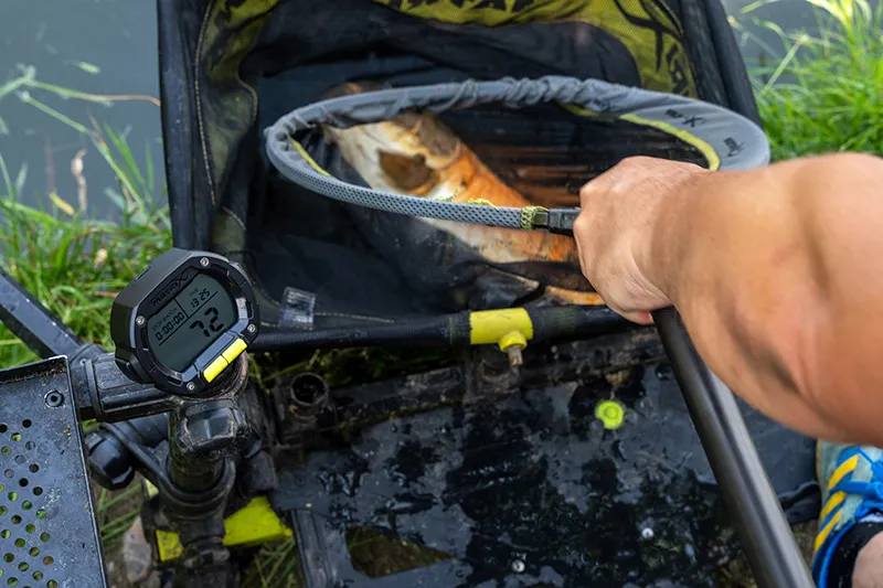 Affiche l’heure, le chronomètre et le poids ou le numéro de poisson