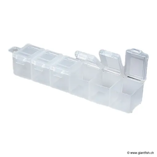 Tai Raba Head Case 6, una scatola robusta e compatta progettata appositamente per organizzare efficacemente tutto il tuo piccolo materiale da pesca. Con i suoi sei scomparti individuali dotati ciascuno di un coperchio, questo contenitore garantisce un riposo chiaro, semplice e sicuro per un utilizzo rapido e pratico sul posto.