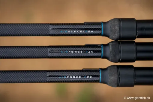 Infine, la gamma Air Force F20 propone diverse declinazioni complementari, permettendo di comporre un insieme coerente per lanciare montaggi, sondare e innescare. Le varie versioni mantengono la stessa filosofia: raggiungere distanze molto importanti con la massima precisione, preservando al contempo un'azione sufficientemente morbida per tutelare i pesci.