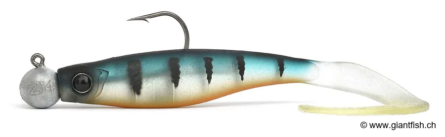 - Tipo di esca: Soft swimbait/grub con testa piombata rotonda integrata in zinco