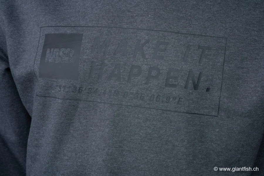 Al centro del progetto, il grande logo con le coordinate Make It Happen richiama i luoghi emblematici in cui il team NASH ha accompagnato numerosi neofiti nei loro primi passi a riva. Questa marcatura distintiva conferisce al capo una forte identità senza risultare vistosa, rendendolo un indumento da pesca comodo e versatile da indossare tanto sulle sponde quanto in città. La vestibilità studiata permette di sovrapporre facilmente strati tecnici sotto o una giacca impermeabile sopra, per adattarsi ai cambiamenti meteorologici.
