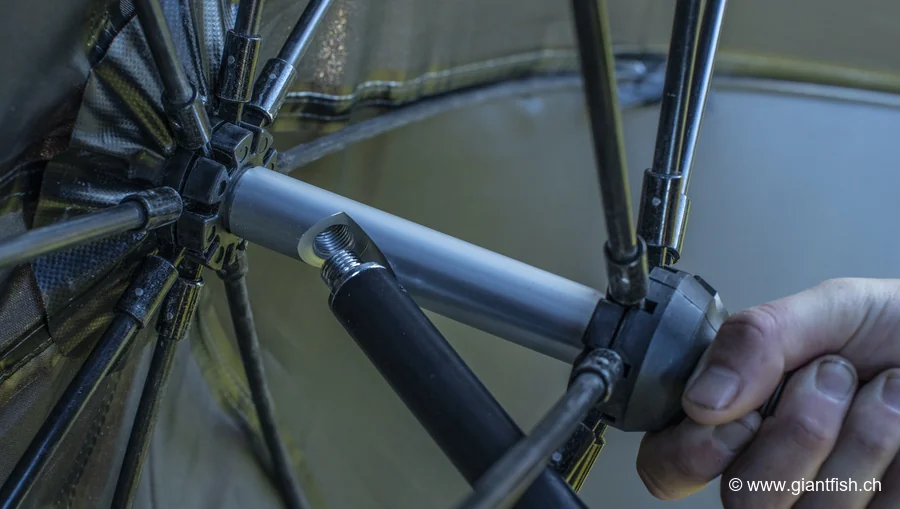 Guru Large Umbrella garantisce un’eccellente longevità, anche sotto condizioni meteorologiche difficili. La struttura in fibra di vetro, molto più resistente delle armature classiche, permette all'ombrello di mantenere la sua forma senza piegarsi di fronte al vento forte. La grande superficie di copertura consente anche di proteggere efficacemente il pescatore nonché gli accessori e l'attrezzatura, offrendo spazio sufficiente per lavorare comodamente. Gli extra fissaggi (cordini, picchetti e attacchi) assicurano una stabilità a prova di tutto. Questo ombrello è adatto a tutti i tipi di pesca all'aperto, su riva o in riva al lago, garantendo
