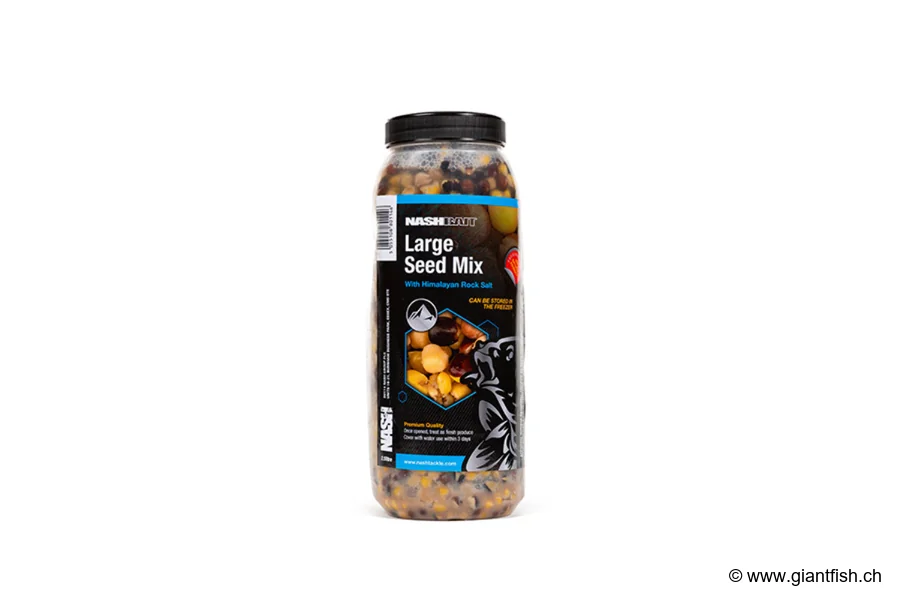 Progettato per i carpisti più esigenti, il Large Seed Mix NASH è una miscela di semi grossi per carpa pronta all'uso, realizzata con ingredienti selezionati con cura. L'associazione di semi di grande taglia crea un segnale visivo e alimentare potente che favorisce una rapida acquisizione di fiducia da parte dei pesci, limitando al contempo la competizione da parte di specie indesiderate. Grazie alla sua preparazione professionale, questa esca premium per carpa assicura una diffusione costante degli attrattori naturali contenuti nei semi, per un'azione duratura sulla vostra zona di pesca. Ogni seme può essere utilizzato indifferentemente per la pasturazione o come esca, permettendo una presentazione discreta e naturale quando la carpa si alimenta. Polivalente, questa miscela funziona in molte situazioni, sia in una sessione rapida sia in una campagna di pre-pasturazione più lunga, in acqua fredda come in piena stagione.