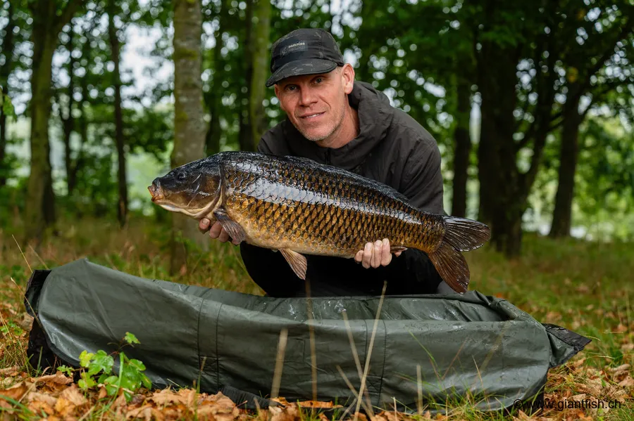 Prima di posare una carpa sul tappetino di ricezione, assicurati di bagnararlo bene per preservare il muco protettivo del pesce. Posiziona il tappeto su una superficie stabile e, se necessario, fissalo al suolo tramite gli occhielli. Quando maneggi il pesce, tienilo sempre sopra il tappetino e limita i movimenti bruschi.